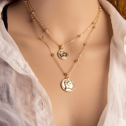 Collier européen et américain, chaîne de clavicule, tête rétro, pièce de monnaie, Double collier.